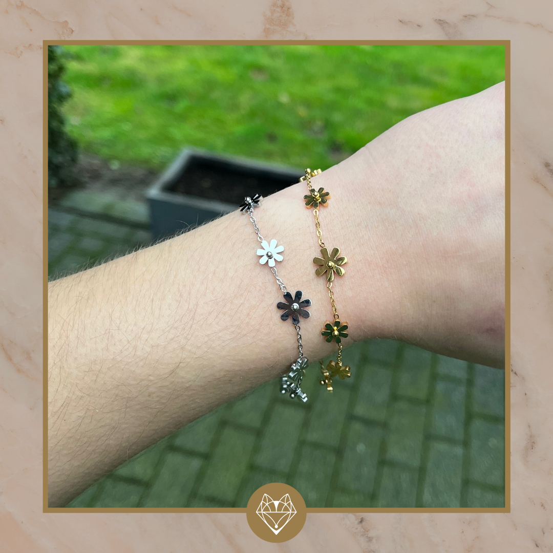 Deze mooie armband bestaat uit bloemen. Je kunt de armband leuk dragen met andere armbanden. De armband is verkrijgbraar in twee kleuren, zilver en goud.